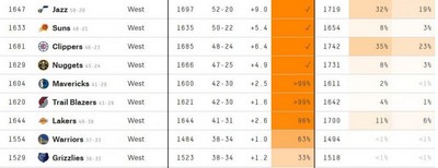 根据BBR的预测,独行侠3.5%概率排名第七;开拓者8.8%概率第七;湖人87.7%概率第七,也就是说湖人以第七打附加赛的概率为87.7%,所以湖人要二连胜+步行者与独行侠二连败几乎不可能。