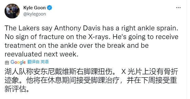 湖人官方宣布,戴维斯遭遇右脚踝扭伤,X光检查结果为阴性(庆幸无结构性损伤),没有骨折的情况,他将在全明星周末期间接受治疗,并在下周进行重新评估伤情。