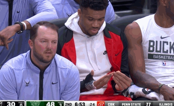 伤停的字母哥在场边轻松观战,他的右手被护具所包裹。