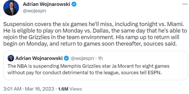 NBA官宣:莫兰特停薪禁赛8场 调查结果出炉:最快3月21日战独行侠复出