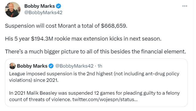 薪金专家Bobby Marks表示,8场禁赛将让莫兰特损失668659美元薪水,他的5年1.943亿美元的合同在下赛季才生效。另外,这也是联盟自2021年来第二长的禁赛,马利克-比斯利曾在2021年禁赛12场。莫兰特的未来损失预计更大,由于这次事件,外界预测他将无法入选最佳阵容,激活不了顶薪合同的条款,届时薪水损失可能达到3900万美元。