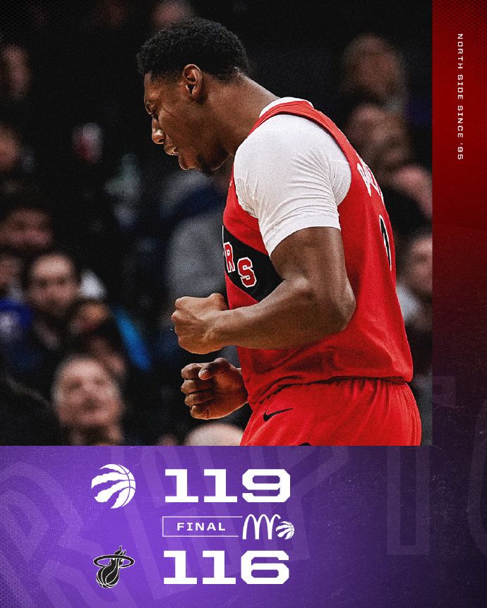 及至末节比赛,猛龙进攻效率大幅下滑,巴雷特接连得分,率领猛龙逐步扩大105-91领先14分优势。热火多点开花反扑追分,希罗最后1分04秒命中三分,猛龙被追到116-113仅领先3分。希罗还剩24秒错失扳平三分,巴恩斯接连被犯规4罚3中,阿德巴约三分命中,最终猛龙119-116险胜热火。