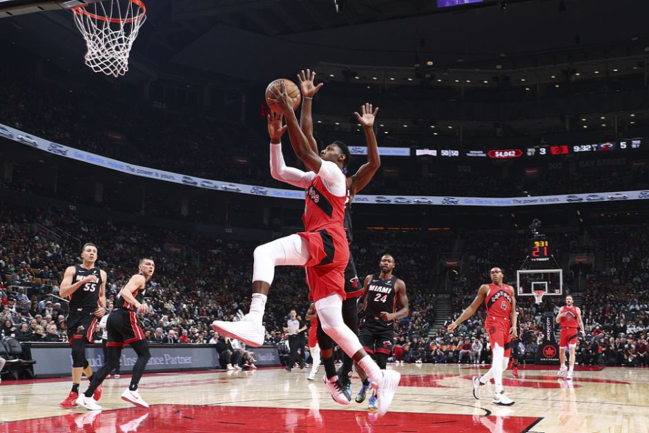 进入次节比赛,双方均是单节轰下30+的展开对攻,热火率先追到40-40平,双方随后缠斗至猛龙55-56落后1分。猛龙打出一波10-4攻势夺回领先优势,上半场结束猛龙被追到65-60领先热火。前两节比赛,希罗9中6得到18分,阿德巴约8中2得到4分11篮板6助攻,巴雷特11中8得到21分与巴恩斯13+6+6,引领猛龙4人得分上双。